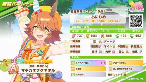 でた。運命を感じた。 ☆白い稲妻、見せたるで! 走行距離50%以上の直線において、順位率70%~75%[8~9位(6~7位)]で追い越し対象が存在する場合、または順位率20%~30%の場合[2~4位(2~3位)] 持続:5 目標速度:0.35 加速:0.1 ▼総評 中段始動。先行から…